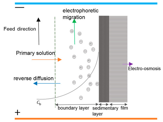 Reducing the thickness of the interfacial layer can alleviate the concentration polarization phenomenon and also reduce the membrane pore blockage caused by the attachment of ions to the membrane surface, which in turn can prolong the membrane lifetime and improve the permeate flux. The mass transfer process of boundary layer particles in the presence of an electric field is shown in Figure 3 [37].