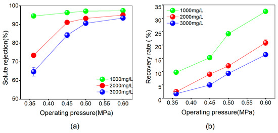 The desalination performance of the MFRO equipment under various salt concentrations is illustrated in Figure 4. Figure 4a shows the solute rejection, while Figure 4b represents the recovery rate. The highest solute rejection achieved for salt concentrations of 1000 mg/L, 2000 mg/L, and 3000 mg/L was 97.37%, 95.08%, and 93.46%, respectively. Meanwhile, the maximum recovery rates were 32.55%, 20.82%, and 16.34%, respectively. In general, lower salt concentrations corresponded to higher desalination and recovery rates. This can be attributed to the lower osmotic pressure and weaker ion interaction in low-salinity solutions, resulting in less concentration polarization. With an increasing ion concentration in the feedwater, the membrane pressure and surface potential changed, leading to increased concentration polarization and potential ion precipitation, which served to obstruct the membrane pores and subsequently reduce the permeate flux and solute rejection. However, beyond a certain range of salinity, where the ion concentration surpasses the membrane limit, the effect on membrane filtration selectivity becomes negligible. In such cases, the solute rejection stabilizes, and no significant changes occur [40,41].