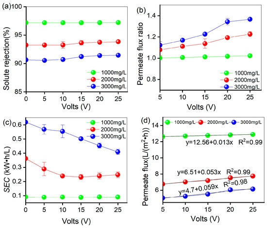 To investigate the correlation between the permeate flux and operating voltage, a linear regression analysis was conducted. The results, presented in Figure 5d, indicate a strong linear correlation between permeate flux and the applied voltage, with R2 values above 0.9 for all three concentrations tested. The data also reveal that the influence of the voltage on permeate flux varies with the salt concentration. At 3000 mg/L, the permeate flux is most influenced by the applied voltage, followed by 2000 mg/L and then 1000 mg/L. The increase in permeate flux with the voltage was relatively small at a salt concentration of 1000 mg/L, but the increase in permeate flux gradually increased with increasing salt concentrations. This suggests that the electric field force has a more significant impact at higher salt concentrations. One possible reason for this observation is that the electric field force can affect the arrangement and orientation of water molecules. This leads to the creation of a driving force that accelerates the movement and diffusion of water molecules, facilitating their passage through the semipermeable membrane. Additionally, concentration polarization at the membrane surface is reduced by ionic electromigration induced by the electric field. Particularly in high-salinity water, the salt ions are highly concentrated and prone to polarization, which inhibits water permeation. The electric field effectively overcomes these effects, thereby increasing the permeate flux of the RO membrane. This effect becomes more pronounced with higher salt concentrations.