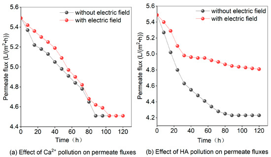 Regarding membrane fouling, the electric field inhibited the decrease in permeate flux due to Ca2+ contamination. Nevertheless, the final permeate flux reduction was similar to that without the use of the electric field. On the other hand, the effect of HA fouling on permeate flux was more pronounced, with the permeate flux decreasing from 5.49 to 4.81 L/(m2·h) after 120 h of operation. However, without an electric field, the permeate flux decreased to 4.23 L/(m2·h). Further studies are needed to determine the exact mechanism behind this phenomenon.