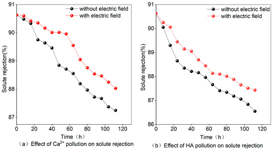 According to the data presented in Figure 7a, the solute rejection was reduced in the presence of CaCl2, dropping from an initial 90.63% to 87.69% without the electric field and to 88.25% with it. This can be attributed to the different ions that accumulate on the surface of the membrane, causing an increase in the concentration polarization phenomenon and a subsequent decrease in the salt permeability rate, ultimately reducing solute rejection. However, when the electric field is applied, Ca2+ migrates directionally, resulting in a relative decrease in the concentration of ions remaining near the membrane and the weakening of the concentration polarization. Consequently, the rejection of solutes is reduced.