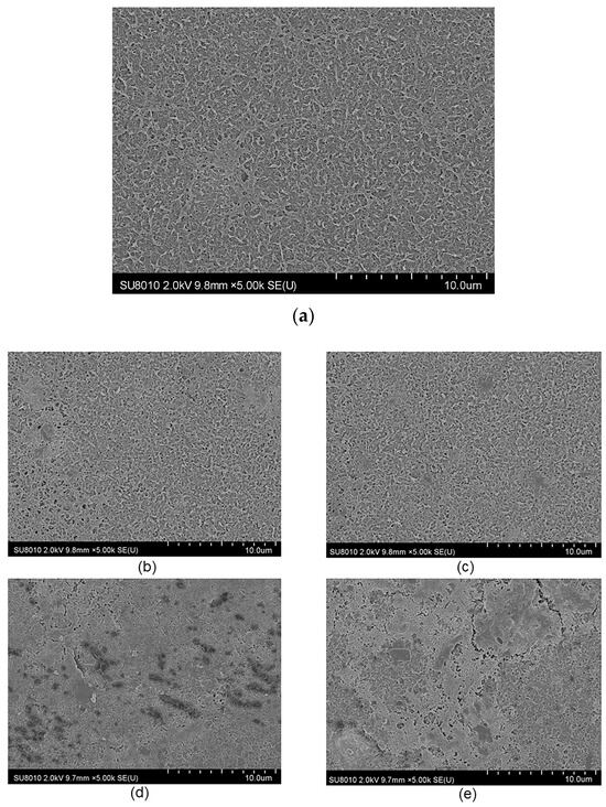 Figure 8a presents the condition of a new membrane, showing a smooth surface free from pollutants. Figure 8b–e depict the membrane surface after the addition of pollutants, indicating the presence of pollutants.