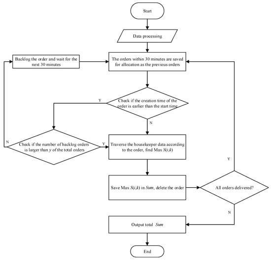 Finally, the sum of the weighted values of all the housekeepers obtained, i.e., the Sum value, is output as an important indicator of the efficiency of job distribution. The above is an overview of the core logic and operational steps of the online order assignment model. For specific implementation details, please refer to the algorithm flowchart shown in Figure 2.