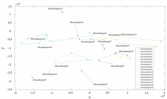 It can be seen that id_housekeeper 0 is assigned to id_order 34, id_housekeeper 1 is assigned to id_orders 5 and 39, id_housekeeper 2 is assigned to id_orders 10, 21, and 44, and id_housekeeper 3 is assigned to id_orders 20, 31, 32, and 38. Figure 4 shows the trajectory of the housekeepers. Finally, the total weighted value Sum is 24.96.