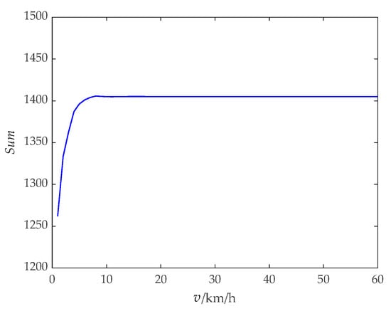 The housekeeper’s moving speed may affect the time when the housekeeper goes to the service location, and the order update time may affect the order data set. Therefore, in this model, a sensitivity analysis is conducted on the two variables of housekeeper moving speed and order update time. To ensure that when the sensitivity analysis of one of the variables, the other variables remain unchanged, so we change the housekeeper’s moving speed from 1 km/h to 60 km/h, observe the change in the total order weight value, and obtain the online order distribution model on the housekeeper’s moving speed sensitivity analysis results, as shown in Figure 5.