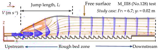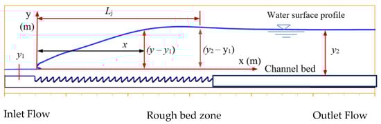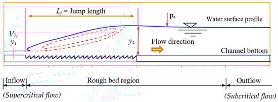 Climate change is becoming increasingly erratic, and flood flows are indeed changing. Many low-head irrigation works or highway sewers have low-energy dissipation efficiency, making it challenging to control floods. A flow carrying large amounts of energy downstream will cause many significant consequences. In that case, it will easily damage the downstream structures and cause erosion downstream of the flood discharge works. Therefore, the need to renovate and repair to improve the working capacity of sewers and limit harmful effects downstream is becoming increasingly urgent. Recently, a new research approach to hydraulic jump on rough beds featured a rather special arrangement of roughness elements on the surface of the channel bed [1,2,3,4,5,6]. The crests of the roughness elements were at the same level as the channel bed surface. Therefore, under the impact of supercritical flow, it avoids the phenomenon of cavitation causing damage to the rough bed structure and, at the same time, achieves the benefit of reducing the downstream water depth and jump length compared to a smooth bed. This has been confirmed by several researchers and published in high-quality scientific journals [1,2,4,7,8,9,10]. Rough bed shapes, including sinusoidal, triangular, rectangular, and trapezoidal, have been studied. These rough beds are generally mainly studied by physical models performed in the experimental laboratory through flow measurement and visualization. This approach may provide helpful information on flow properties and raise an experiment’s expense.