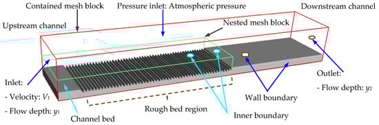 In this research, the calculated domain of the numerical models is made up of two mesh blocks (see Figure 2). The contained mesh block was set up for the whole numerical model space; meanwhile, the rough bed region is set by the nested mesh block because these regions need a finer mesh to capture the flow behavior better. A structured grid with the same three-dimensional grid size was used in these numerical models. This study also considers three computational grids (see Table 2) to evaluate the calculated grid independence for the numerical result, determine the appropriate grid size for the best steady numerical results, and apply this grid to the subsequent simulations.