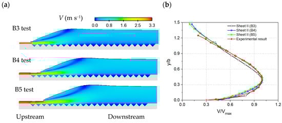 Table 6 shows the experimental comparison with the simulation model data for hydraulic jumps, with a relative error of less than 5%. The error may be due to the measurement error and boundary layer effects. On the other hand, Figure 3 shows that the normalized forward flow velocity profile between numerical simulations and experimental results agrees well. It shows that the numerical results correlate well with the experimental data by Samadi-Boroujeni, H. et al. [4]. Thus, the reliability of the numerical model is validated.