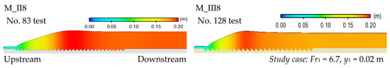 The water surface profiles in this numerical simulation are determined by the VOF method. The water surface profiles in these simulations help design an efficient construction of the stilling basin’s side wall heights and floor lengths. The coordinate system for defining the water surface profiles is described and shown in Figure 4. These numerical results of a typical free surface elevation on M_I and II bed models are presented in Figure 5.