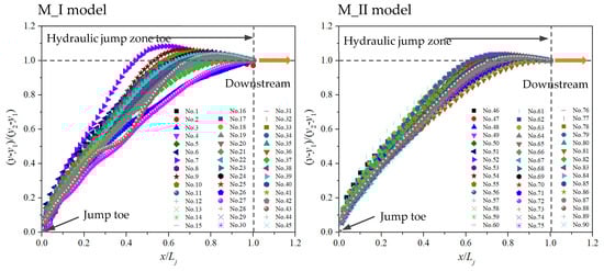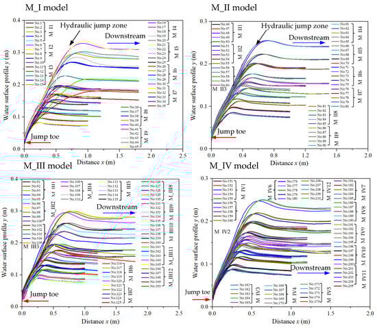 The water surface profiles are illustrated in Figure 6. These figures clearly describe the hydraulic jump and downstream regions. In there, jump toes are at the start points of the right triangular prism rough beds. In addition, the water surface profiles for the hydraulic jump region are also detailed in Figure 7, indicating that the normalized water surface profiles on different rough beds are also nearly similar.