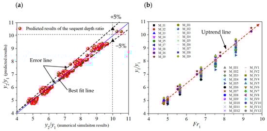 (a) predicted versus numerical results of y2/y1; (b) y2/y1 versus Fr1 for rough beds.