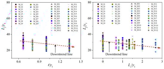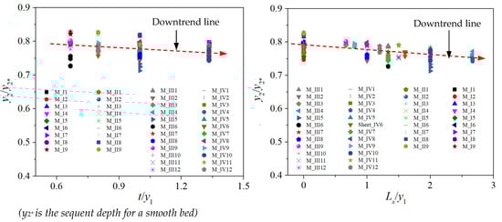 Equation (12), which obtained a very high correlation coefficient of 0.987, indicated that the y2/y1 predicted results agreed with the y2/y1 value from numerical simulation results (error < 5%), as shown in Figure 8a. From Equation (12), the y2/y1 values were strongly dependent on Fr1 (see Figure 8b), which is understood when supercritical flow changes to subcritical flow through the hydraulic jump phenomenon. On the contrary, the two parameters (t/y1 and Ls/y1) decrease with the sequent depth ratio, as shown in Figure 9. According to MLR analysis results, the upstream and downstream slopes of triangular roughness (m1,2) have a minimal effect on the increase in sequent depth ratio. Thus, it is absent in Equation (12). This could be explained by the variation in the flow field in the hydraulic jump zone and the small eddy structures that appear within the rough bed range (analyzed in detail in Section 3.7).