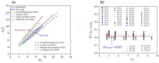 (a) y2/y1 values versus Fr1 for this study and other works; (b) D values versus Fr1 for rough beds [1,2,4,5,7,8,9,13].