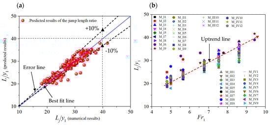 (a) predicted versus numerical results of Lj/y1, (b) Lj/y1 versus Fr1 for rough beds.
