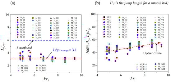 Figure 10a plots this study’s depth ratios (y2/y1) and earlier studies versus Fr1. This figure shows that the depth ratio y2/y1 for the rough beds is smaller than the smooth bed (classical jump). Therefore, the effect of the right triangular prism rough beds reduces in comparison with the conjugate depth. The results of this study also indicate a good agreement with those obtained by previous studies [1,2,5,7,8,13].