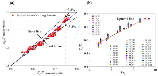 (a) Predicted versus numerical results of EL/E1, (b) EL/E1 parameter against Fr1.