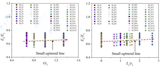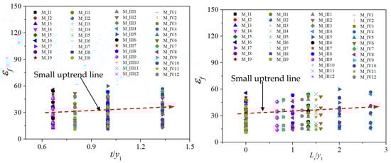 The εf predicted values calculated by Equation (17) are compared with the εf numerical simulation result values, as shown in Figure 18a. This figure shows that the εf values calculated by Equation (17) entirely agree with the numerical result values with an error of <10%. Equation (17) demonstrates that the εf values are strongly dependent on Fr1 parameters. On the contrary, the two parameters (t/y1, Ls/y1) have a negligible effect on increasing the bed shear stress, as shown in Figure 19.