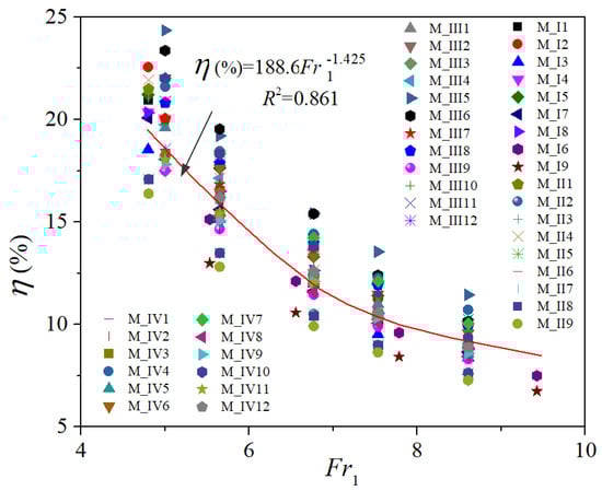 Figure 17 shows the η values versus Fr1 parameters. This figure indicated that the right triangular prism rough beds used in this study had increased the energy loss in flow. In more detail, the increase in energy loss varies from 4% to 24% compared with smooth beds at the same initial Froude number condition. Therefore, these rough beds improve the flow’s energy dissipation in the hydraulic jump region.