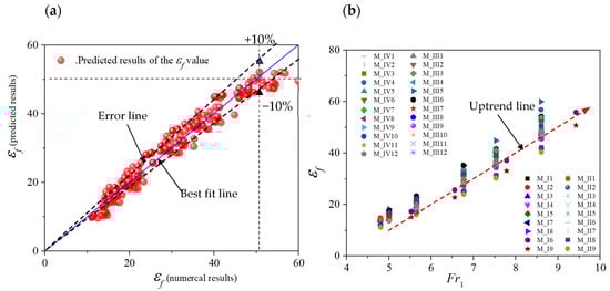 (a) Predicted versus numerical results of εf, (b) εf parameter against Fr1.