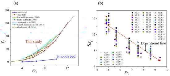 In Figure 20a, the shear force coefficient εf was plotted versus inlet Froude numbers Fr1 for other works. This figure shows good agreement between this study’s and previous researchers’ results. On the other hand, Figure 20b shows that the number of εf hydraulic jumps over the right triangular prism rough beds is almost ten times that of the bed shear stress in jumping over the smooth bed, and it can be written by the equation below:
