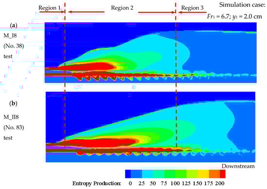 Recently, more and more researchers have reported that losses within internal flows often attributed to pressure losses are related to the local entropy production rate. The local energy dissipation rates could be figured out and integrated over the flow domain to obtain the losses. Therefore, to further clarify the influence of rough bed characteristics, in this section, we use the entropy production rate to analyze energy dissipation in hydraulic jumps. We used commercial software Tecplot (360 EX 2022R2 version 2022.2.0.18713) and the entropy determination formulas in Section 2.4 to display entropy distributions. Figure 21a,b shows the entropy production rate distribution in the case of the triangular rough bed with m1 = 0 (M_I8 (No. 38) test) and m2 = 0 (M_II8 (No. 83) test); for more detail see Table 7.