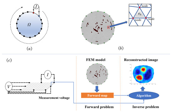 The principle of operation of EIT is demonstrated in Figure 1. When conducting scientific investigations, EIT is commonly studied from two primary perspectives: the forward problem and the inverse problem [29], as depicted in Figure 1c. The forward problem involves the computation of changes in the voltage observed on the object’s surface by considering the distribution of conductivity within the object of interest and the applied excitation current. In medical imaging, the excitation current frequency typically falls within the range of 10–100 kHz for EIT. The objective of EIT image reconstruction centers on estimating the distribution of conductivity within a sensing region by administering electric currents and measuring the resulting variations in the boundary voltage [30]. The Dirichlet-to-Neumann (DtN) map, which forms a crucial part of the mathematical model utilized in EIT, is at the core. It is an essential element for investigating elliptic partial differential equations, thereby having a substantial impact on the classical Calderon problem [31].