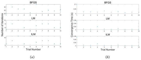 The results obtained from running the Broyden–Fletcher–Goldfarb–Shanno (BFGS), LM, and improved LM algorithms simultaneously are shown in Figure 4. Figure 4a displays the iteration time required to achieve the same termination condition for the objective function value. Figure 4b reveals that the ILM algorithm is similar to the classic LM algorithm in the early iterations but significantly diverges after a certain number of iterations. The ILM algorithm converges each parameter to the target value faster, resulting in faster running speed and significantly fewer iteration steps to reach the same termination condition. In summary, the ILM algorithm provides a search direction closer to the target descent direction, with faster convergence speed and fewer iteration steps.