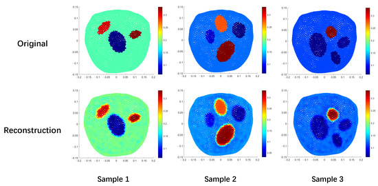 Let represent the voltage measurement value and denote the conductivity change. Then, indicates that the number of pixels is significantly larger than the measurement value. Furthermore, the measurement vector b is always affected by noise. Hence, the problem of image reconstruction involves recovering the conductance image from measurements with noise [32].