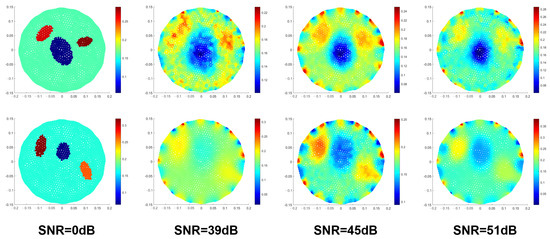 This experiment examines the anti-noise performance of the Newton-based GCN by adding Gaussian noise to the simulated data. Specifically, Gaussian noise with signal-to-noise ratios of 0 dB, 39 dB, 45 dB, and 51 dB is added when calculating the voltage data on adjacent electrodes. These four values cover a wide range of SNR conditions, ranging from very low (0 dB) to very high (51 dB). They can be used to evaluate the performance of the system under different SNR conditions [53]. The Newton-based GCNM algorithm is then used to reconstruct the static image. The reconstructed images under different SNR conditions are compared with the noise-free reconstructed image to analyze the anti-noise performance. Figure 7 displays the reconstructed images at different SNR levels.