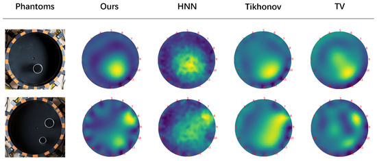 Based on the data presented in Table 2, it is evident that our algorithm outperforms the other methods in terms of the and evaluation indicators while ranking second in terms of . Although artifacts are present in the reconstructed images produced by all three methods, the artifacts are most effectively reduced in the reconstructed images generated by the proposed algorithm. It is important to note that actual measurements are subject to measurement errors, model errors, and environmental noise interference, which result in a reduced signal-to-noise ratio of the measured voltage. Consequently, the quality of the actual reconstructed image is lower than that of the simulated calculation. This further supports the conclusion that our alogrithm offers superior imaging quality.