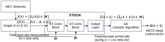 In Figure 1, we show the overall procedure of our MECS sleep control strategy. Our MECS sleep control method is composed of two modules. In the first module, at the beginning of each time slot t, a controller predicts by using the spatio-temporal correlations among the recent past , where h is the length of the past task arrival rate history. We denote the predicted as . The second module uses the genetic algorithm to determine the MECS sleep control vector by using , , and , for all . We explain the operation of each module in the following subsections.