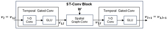 As we can see in Figure 1, STGCN is composed of two consecutive ST-Conv blocks and one output layer. The ST-Conv block is composed of a spatial Graph-Conv module in between two temporal Gated-Conv modules (Figure 2). The Gated-Conv module is composed of a 1-D convolution unit having a width kernel followed by GLU (gated linear unit). We denote the input to the k-th temporal Gated-Conv module in the l-th ST-Conv block as where . Then, for each node in G, the 1-D convolution unit performs temporal convolution on by exploring neighbors, which reduces the sequence length from h to . Two linear layers in the GLU take the temporal features extracted by the 1-D convolution unit and produces and , respectively. Then, GLU outputs by computing , where ⊙ is the element-wise Hadamard product. Therefore, if we denote the temporal convolution kernel for the k-th temporal Gated-Conv module in the l-th ST-Conv block as and the temporal gated convolution operator as , the temporal gated convolution is expressed as