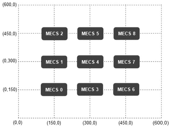 We deploy nine MECSs uniformly across a grid with dimensions of 600 m by 600 m (Figure 3). The service region of each MECS is configured as the surrounding four grids with itself at the center. At the beginning of the simulation, we uniformly deploy 275 users on the topology. Users move around over time according to a random mobility model. In other words, at the start of each time slot, a user changes its moving direction from , according to the Uniform distribution, and selects its speed from the Normal distribution with a mean 15 m per time slot and a variance of m per time slot. To maintain the number of users in the topology, we assume that the top and bottom, as well as left and right, of the system topology are connected. Therefore, for example, when a user moves to the right and exits the topology, we add a new user to the left side of the topology.