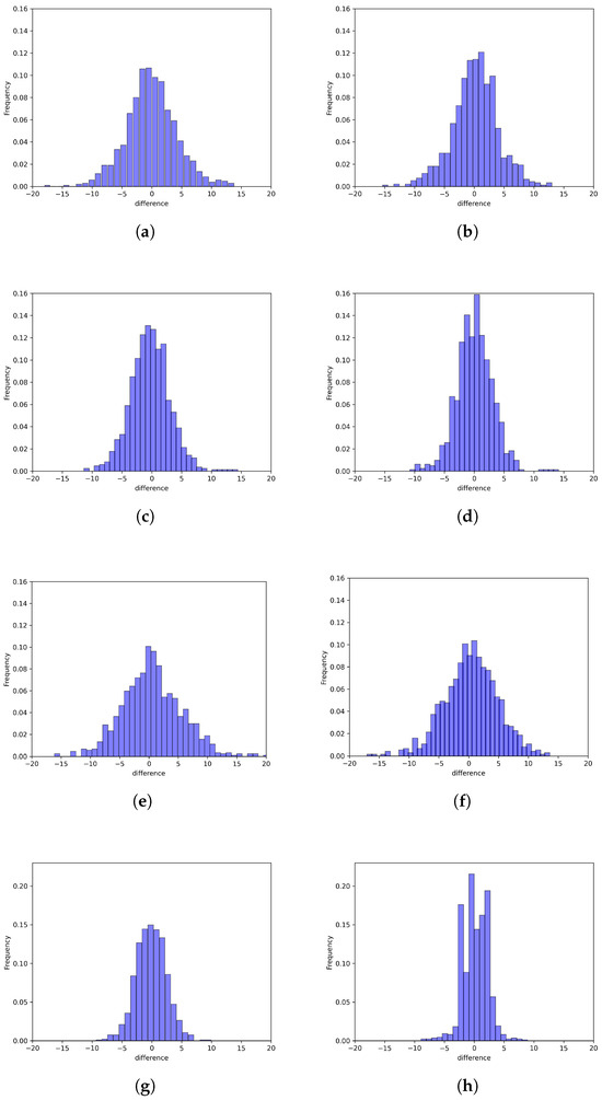 Comparison of task arrival rate error distributions. The term ‘Total’ represent the case where all MECSs are considered. (a) LSTM, MECS 3, (b) STGCN, MECS 3, (c) LSTM, MECS 4, (d) STGCN, MECS 4, (e) LSTM MECS 8, (f) STGCN, MECS 8, (g) LSTM, Total, and (h) STGCN, Total.