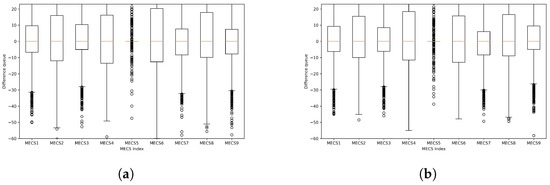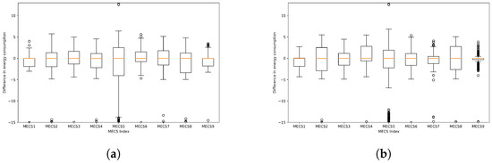 Comparison of energy difference distributions for each MECS. (a) Box plots for ; (b) Box plots for .