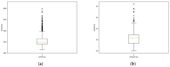 End-to-end inference time distribution comparison. (a) LSTM-GA; (b) Proposed method.
