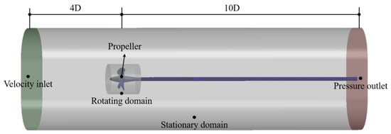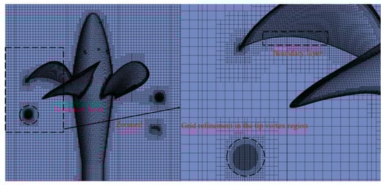 Before carrying out the prediction for propeller TVC inception based on the aforementioned models, we need to determine the size of entire calculation domain and perform the appropriate calculation setup. The calculation domain is a cylinder coaxial with the propeller, as illustrated in Figure 2, where the left is the velocity inlet boundary and the right is the pressure outlet boundary. The blade surface adopts non-sliding wall conditions and other wall surfaces adopt free wall conditions. The distance from the propeller disk surface to the velocity inlet and the pressure outlet are 4D and 10D, respectively, and the distance between the side boundary and the propeller center is 2.5D. We divide the calculation domain into two parts—a stationary domain and a rotational domain—using sliding grids. Moreover, the low pressure and larger radial pressure gradient at the tip vortex core concern the suction, growth, and collapse processes of bubbles. Therefore, it is necessary to conduct a grid refinement in the tip vortex region to reduce the numerical discrete error effectively and simulate the low pressure and the larger radial pressure gradient at the tip vortex core accurately. Finally, the number of grids is set to 13,000,000, and the details of grids are shown in Figure 3. With the aim of ensuring the stability of bubble dynamics iterations, the time step of the unsteady calculation is set to the time taken for each 0.2° rotation of the propeller.
