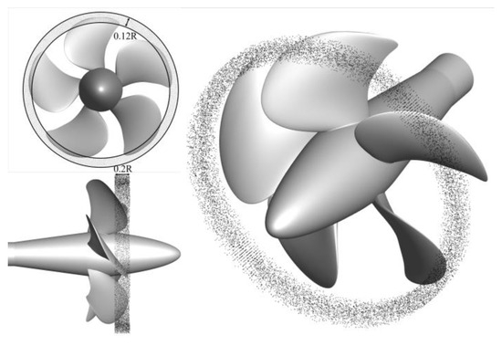 The initial sizes of nuclei have significant influences on the prediction of tip vortex cavitation inception, as a nucleus with larger size is prone to be captured by a tip vortex and grows to an incipient cavitation bubble [56], leading to a higher predictive value of the incipient cavitation number. The literature [57] argues that the initial radius of a nucleus R = 100 μm can be used as the maximum nucleus radius in the practical calculation of a cavitation tunnel. In the literature [58], nuclei with three different initial diameters are selected for the calculation, and it is found that the initial radius of a nucleus R = 50 μm can satisfy the discrimination criterion of cavitation inception in engineering applications. The existing experimental measurement results indicate that the diameters of nuclei in the water are mainly distributed between 40 μm and 60 μm. In summary, in order to eliminate the influence of the nucleus initial size and make the proposed cavitation inception discrimination method based on bubble dynamics in this paper more applicable, the nucleus initial diameter selected in this paper is a fixed value of 50 μm by referring to the nuclei spectrum given by the experiments in [55]. There are 14,040 nuclei in total, which are released randomly in an annular region 0.2R–1.0R away from the upstream of the propeller disk surface. The initial release region of nuclei is shown in Figure 4.