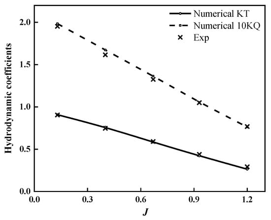 An open water experiment refers to an experiment conducted on a propeller model in a uniform inflow, and the hydrodynamic performance of the propeller obtained using direct and indirect measurements in an open water experiment is called propeller open water performance. The simulation accuracy of propeller open water performance reflects the rationality of the selected calculation model and grid settings. In this paper, we conduct a prediction for the open water performance of the PPTC propeller, select an advance coefficient range of 0.1334~1.0683, and compare the predicted results with the experimental results [55]. The thrust coefficient KT and torque coefficient KQ are respectively given by Equations (12) and (13):