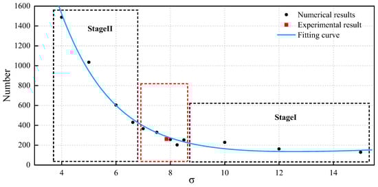 In order to better reflect the variation trend of the number of incipient cavitation bubbles with the cavitation number, we count up all incipient cavitation bubbles under the circumstance of different cavitation numbers, respectively, and fit them with an exponential function curve, as shown in Figure 8. The scatter points in Figure 8 are the results calculated with numerical simulations, and the curve is the fitting result. The R-Square value of the curve fitting is 0.957, which indicates that the fitting has a higher confidence level and can fully reflect the variation trend of scatter points. It should be noted that although the number of incipient cavitation bubbles presents an upward trend with the decrease in the cavitation number on the whole, the numbers within different cavitation number ranges are not the same.