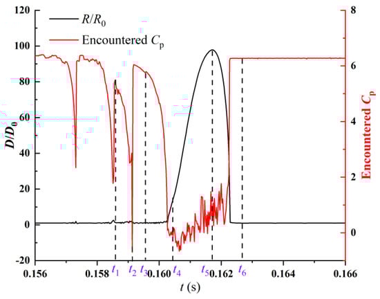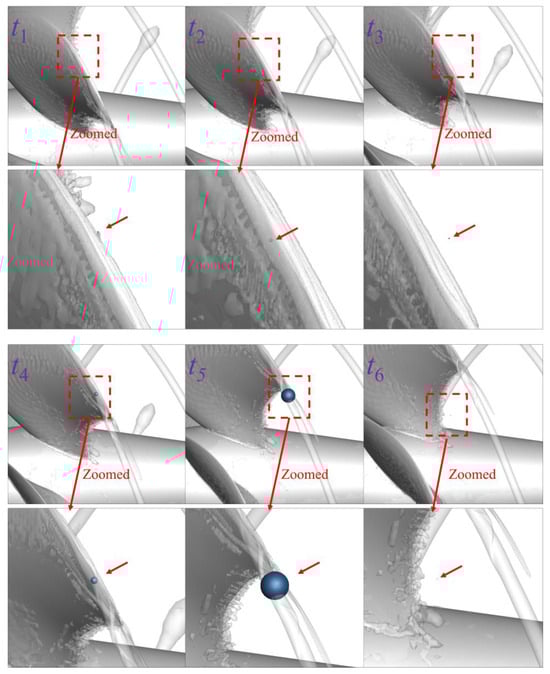 Figure 11 shows the variation curves of the coefficient of the pressure on the nucleus surface and nucleus radius under the operating condition with an advance coefficient of J = 0.9725. In order to analyze in detail the influence of a tip vortex flow on nuclei evolution in the flow field in which the nuclei are located, we select six representative times—t1, t2, …, t6—in the growth and collapse processes of nuclei under the influence of the tip vortex, presenting the typical process of nuclei being suctioned into the vortex core by the tip vortex, starting to grow, leaving the tip vortex and collapsing, as illustrated in Figure 12. To facilitate observation, the nuclei in the figure are all magnified to eight times their actual sizes for presentation, and the grey semitransparent isosurface represents an isosurface with Q = 240,000 s−2 which is used for characterizing the morphology of the tip vortex.