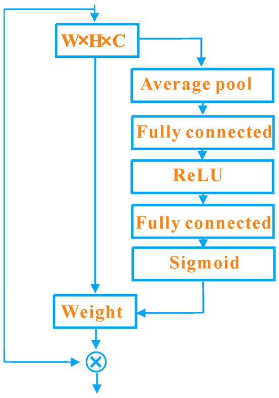 The SE attention module (Squeeze-and-Excitation attention module) is a module used to improve the performance of convolutional neural networks by dynamically adjusting the weights of input feature maps. The core idea of the SE attention module is to recalibrate the features of each channel, enabling the model to focus more on features with important information [21]. One advantage of the SE attention module is that it can adaptively learn the dependencies between different channels, thereby improving the performance of a model. Additionally, the SE attention module can be combined with other attention mechanisms (such as spatial attention and channel attention) to further enhance the performance of a model [22,23].