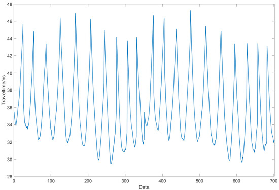 Figure 4 shows the recording geometry and corresponding reference velocity model , with red dots representing the emission source and black dots representing the receiver; the positions of the ND = 702 group source and receiver can be identified by connecting the ray paths. Figure 5 shows the corresponding first-arrival travel time data that were automatically retrieved.