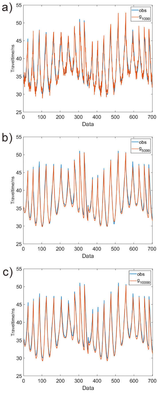 (a) Traveltime data simulated based on ; (b) traveltime data simulated based on ; (c) traveltime data simulated based on .