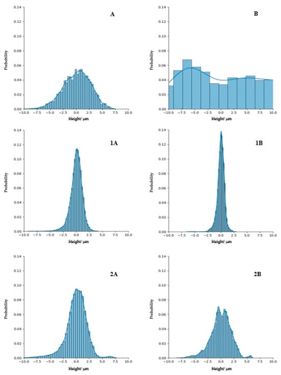 Height distribution curve—filtered profile ((A) Control sample; (1A) Mechanized polished samples; (2A) Manually polished samples); unfiltered profile ((B) Control sample; (1B) Mechanized polished samples; (2B) Manual polished samples).