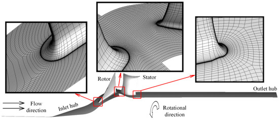 The commercial software Numeca equipped with Fine/Turbo solver was taken to simulate the fluid flow in the blade passage. The compressible Reynolds-averaged Navier–Stokes equations were solved based on the conservation equations of mass, momentum, and energy, as shown in Formula (1)–(4).