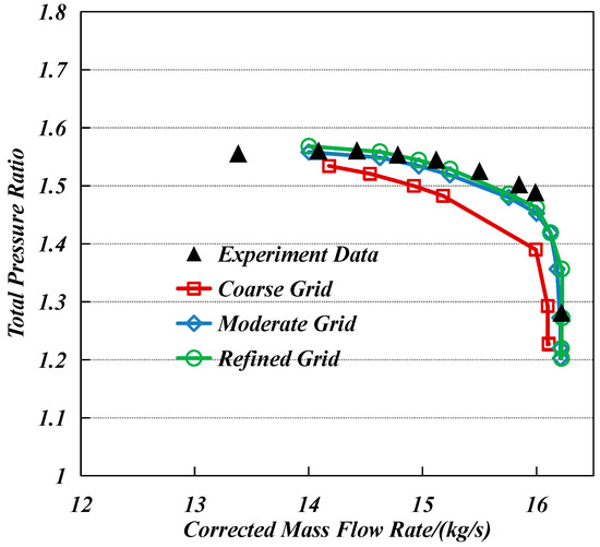 The blade’s structured grid was generated by the AutoGrid5 module, as depicted in Figure 2. To minimize the influence of inlet and outlet parameters on the blade passage, the inlet was positioned approximately four times the rotor chord length away from the rotor root leading edge, and the outlet was set around nine times the stator chord length from the stator root trailing edge. Meanwhile, grid points were refined near the walls and the blade leading/trailing edges to improve solution accuracy. The y+ value remained below one in most regions. It should be noted that due to the fillets at the rotor hub, stator root, and blade tip, as well as the significant three-dimensional twist of the blades, y+ values in these tiny, localized regions were within eight. Then, characteristic curves at 100% rotational speed were solved by three varied grid densities based on the described numerical settings. The results were compared with experimental data as illustrated in Figure 3. The figure demonstrates that the trend of the characteristic curves obtained from numerical simulation is consistent with the experimental values. Furthermore, when the number of grids exceeded 1.9 million, the solved characteristic curves were nearly identical. For a balance between accuracy and efficiency, a moderate grid density, tallying at 1.92 million points, was deemed suitable for the computational domain’s mesh.