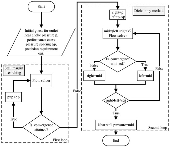 The flow chart illustrated in Figure 4 provides the basic procedure of the dichotomy method. This automated solution flow chart mainly involves two parts. One is the iterative steps for stall margin searching, and the other is the loop for determining a stall point through the dichotomy method. With the powerful integration capabilities of the Isight platform, this process is automated by macro commands to invoke the Fine/Turbo solver. The initial parameters comprise the guess pressure p, the pressure increment step Δp, and the solution accuracy equations, which were 90 kPa, 10 kPa, and 100 Pa, respectively, adopted in the study. During stall margin searching as exhibited in Figure 4, boundary conditions are uniformly altered based on computational convergence, determined by the criteria outlined in Equation (5).