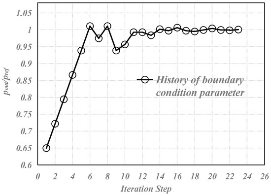 Figure 6 provides the history of back pressure values at the compressor outlet (pout) during the iteration process through the dichotomy method. The outlet pressure was made dimensionless by using a reference pressure, where the reference pressure (pref) is 138,500 Pa. Thus, in the subsequent comparisons, when the result (pout/pref) approached one, the fewer the iterative steps required, the higher the efficiency. As can be seen from the figure, it is evident that after six cycles of stall margin searching and the subsequent eight iterations for the stall point searching, the boundary point was ultimately determined, resulting in a pressure value of 138,476 Pa at that moment.