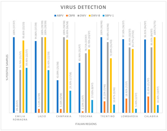ABPV was detected in all regions and was present in all samples from Trentino (46) and Emilia-Romagna (37), while in the remaining regions, the percentage of positive samples was between 43.1% in Campania and 97.3% in Lombardia (Figure 1).